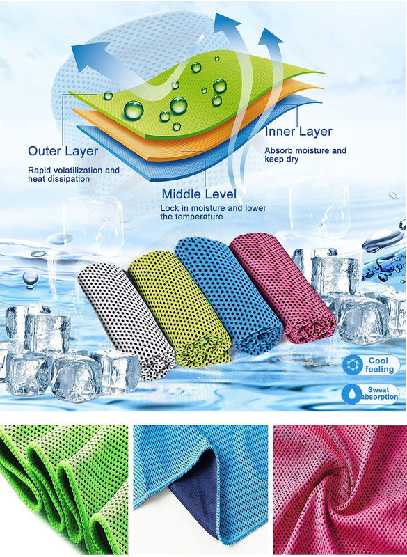 Une serviette de refroidissement en microfibre améliore l'effet de refroidissement grâce à l'évaporation de l'eau, et la sensation de fraîcheur dure plus longtemps après avoir été humidifiée.